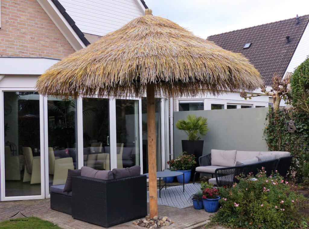 We also have Asian reed, an artificial reed roofing that gives your roof a natural, exotic and tropical look. A beautiful product for the roofs of zoos or amusement parks. And of course for swimming pools and campsites. But also for your gazebo or garden house in the backyard, the holiday atmosphere at home. Asian reed is made of HDPE. HDPE is a sustainable material with a lifespan of more than 40 years and is also 100% recyclable. Asian reed retains its color. the Asian reed is often sold on umbrella’s. But can of course also be used as roofing material on a bar or gazebo.